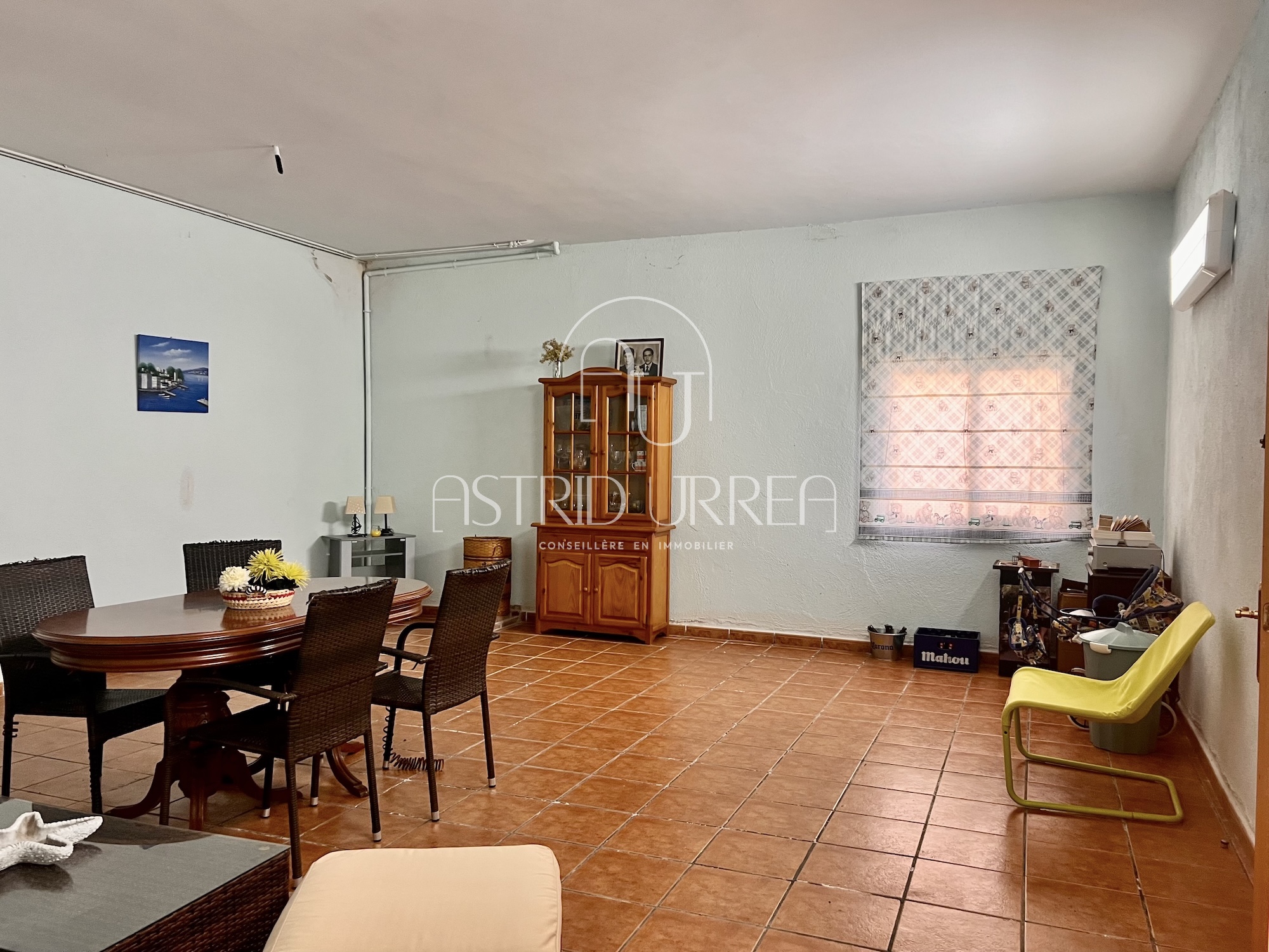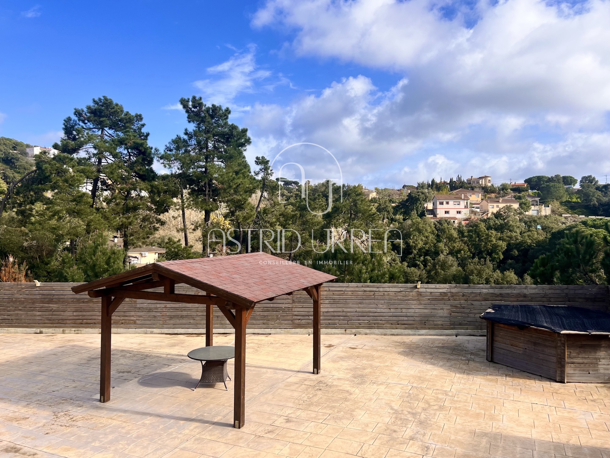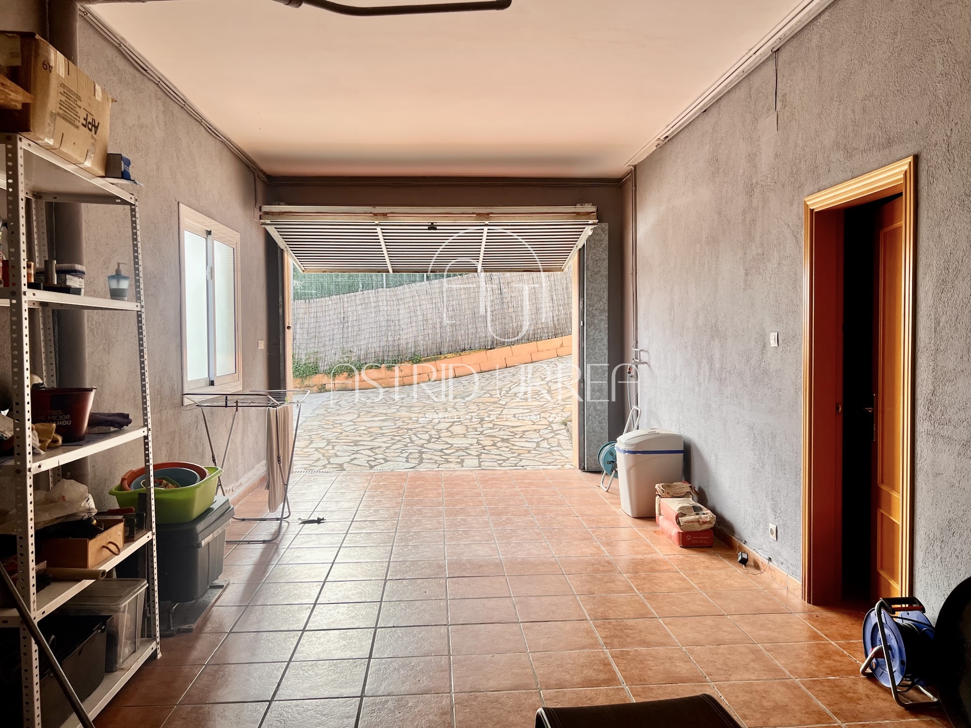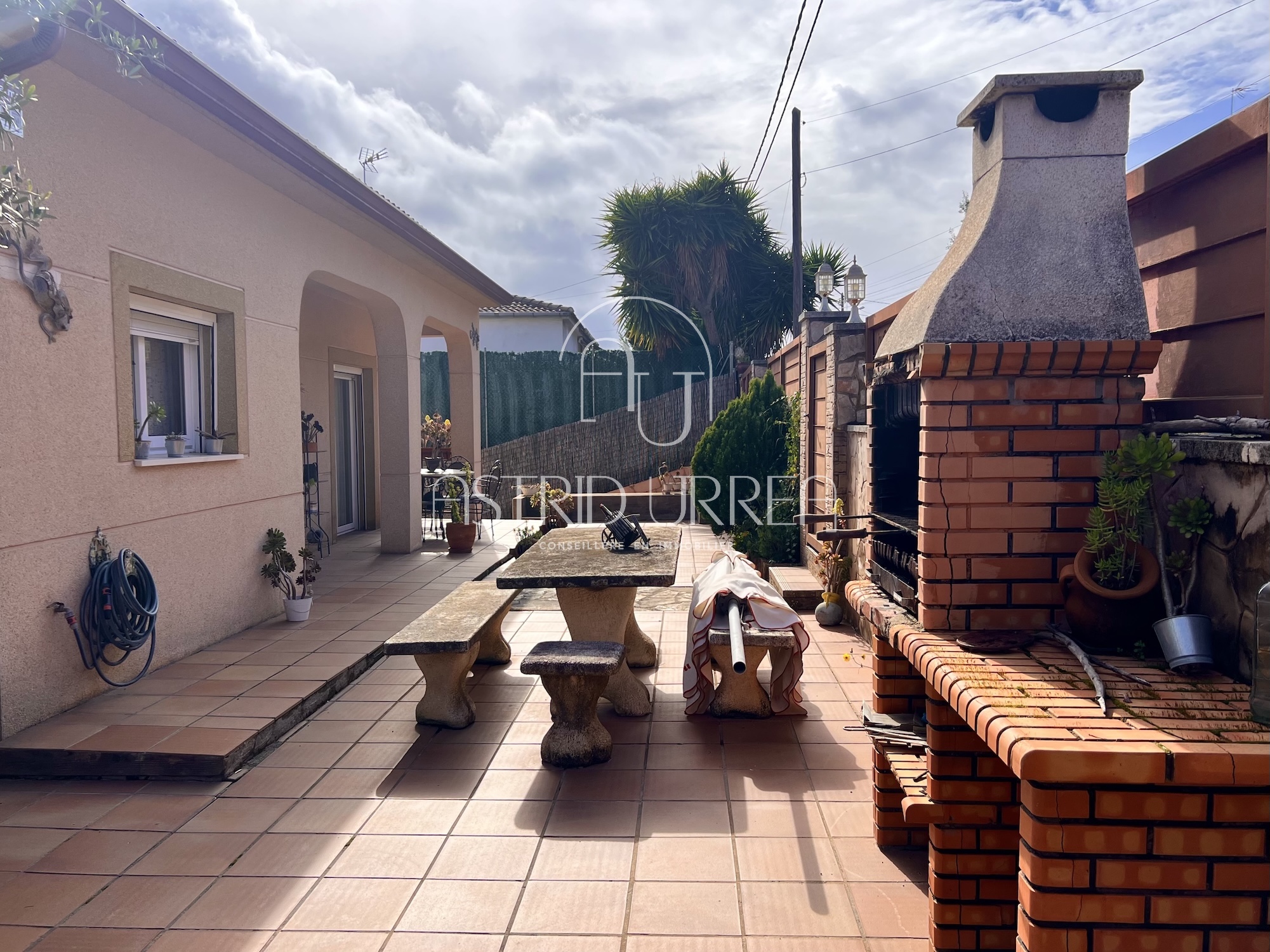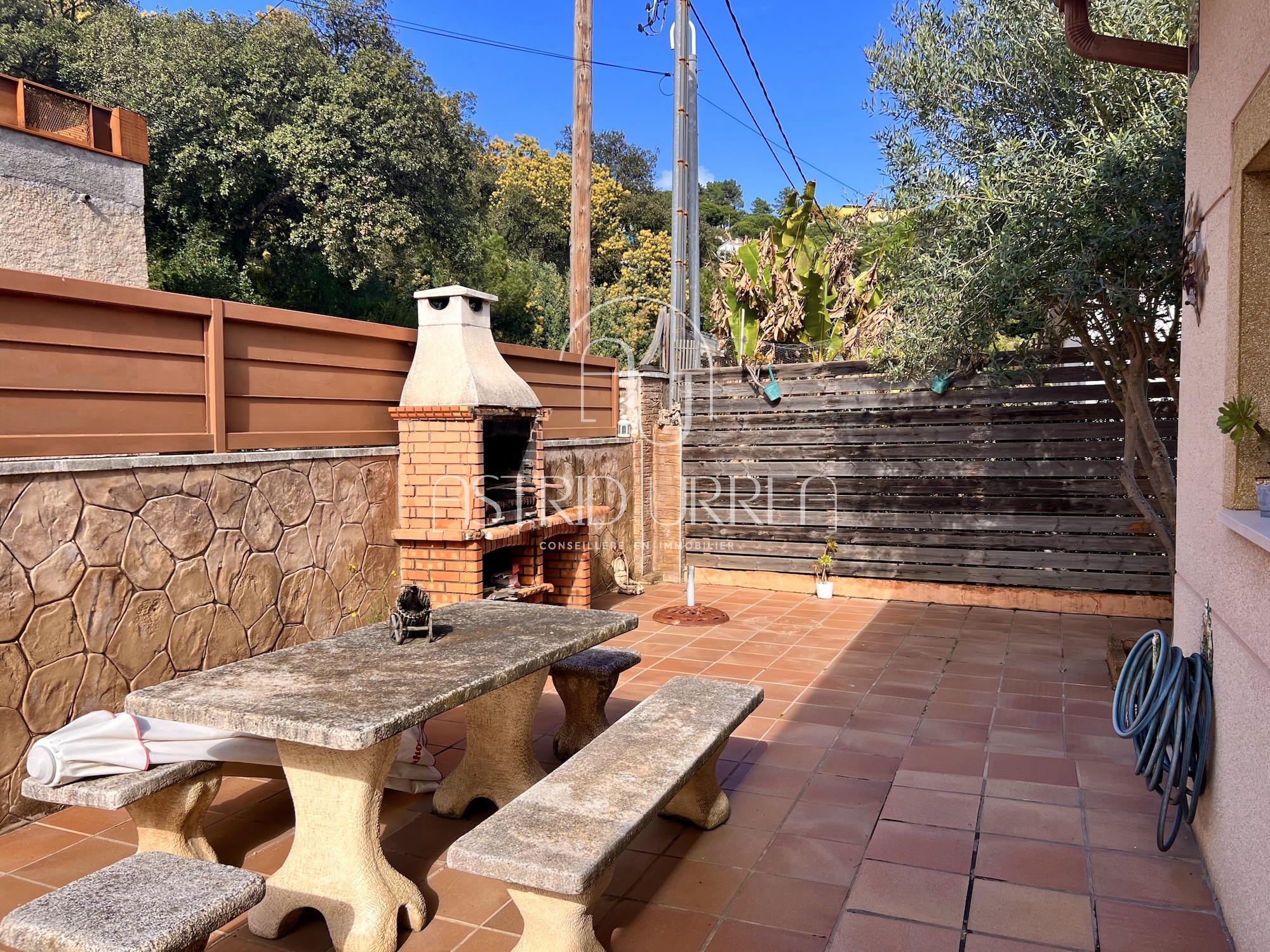 The single-story house, with direct access from the street, features a large, separate kitchen, a bright living room opening onto the terraces and barbecue area, and a sleeping area with three bedrooms and a bathroom. The spacious master bedroom has a large built-in wardrobe with sliding doors and access to a terrace offering panoramic views of the hills.