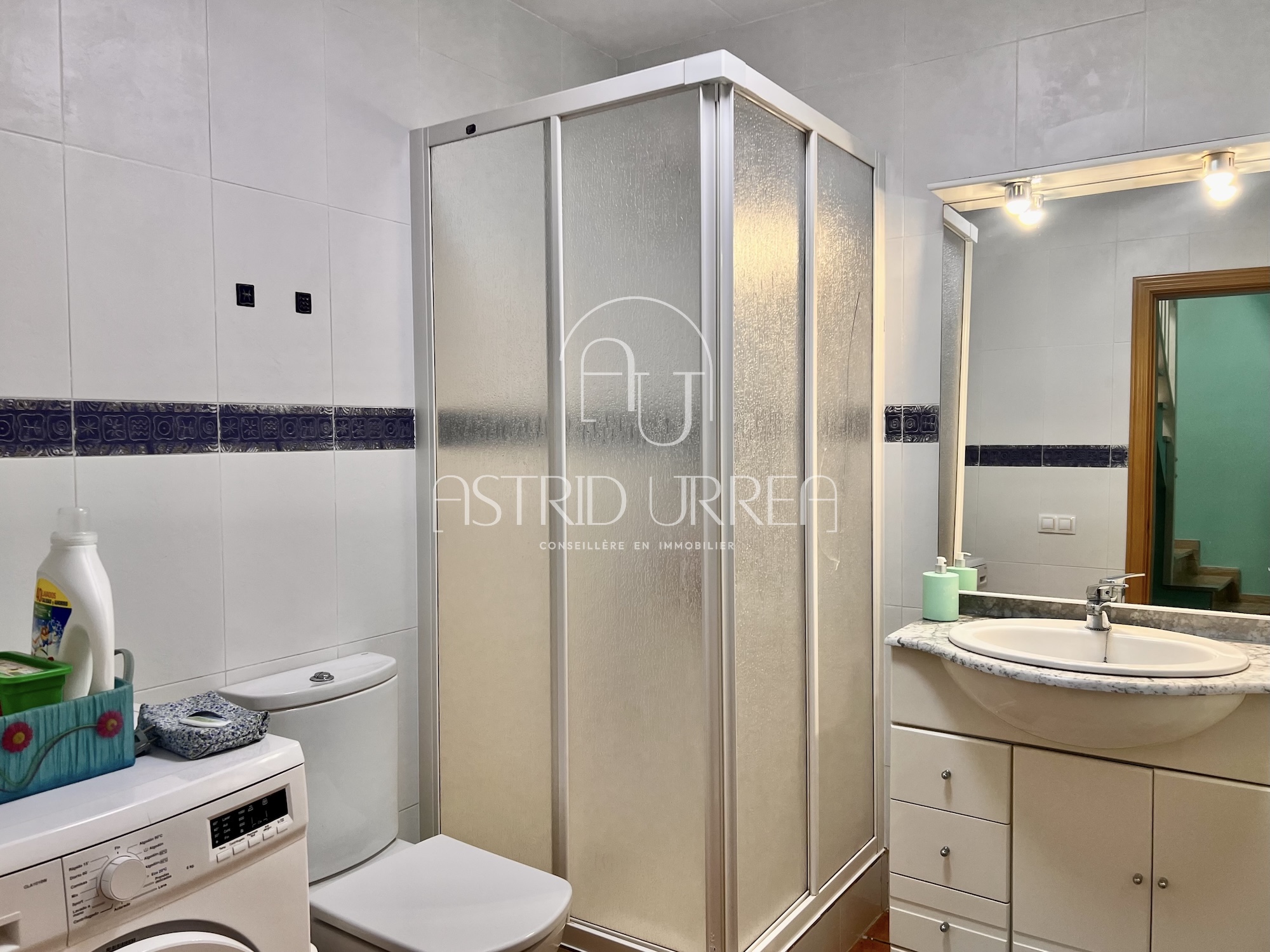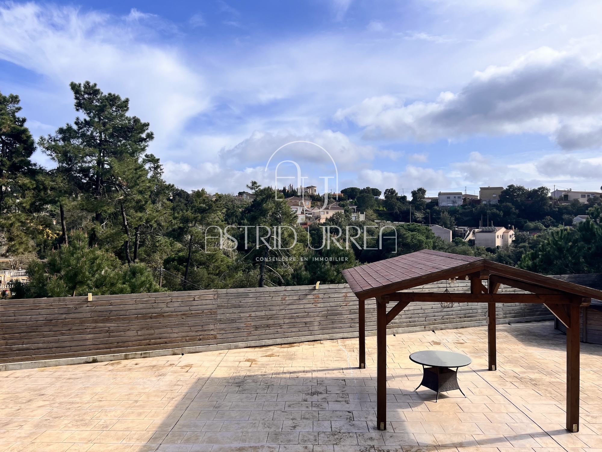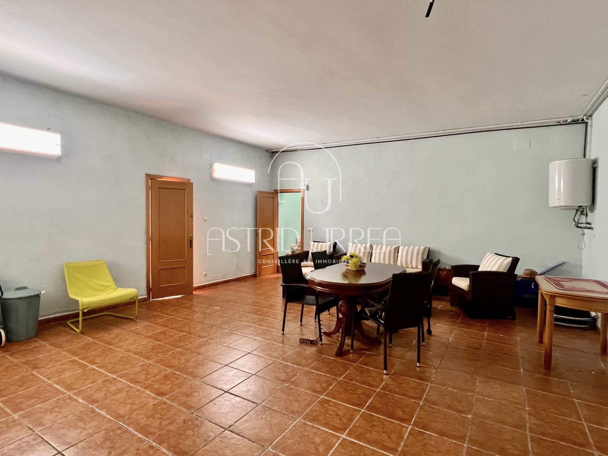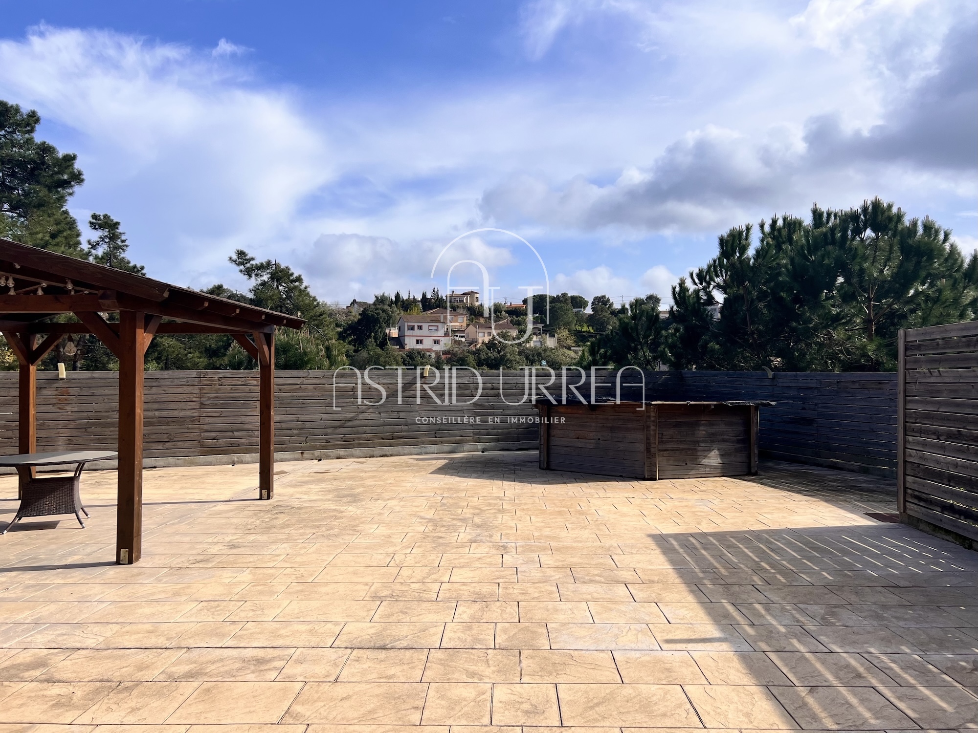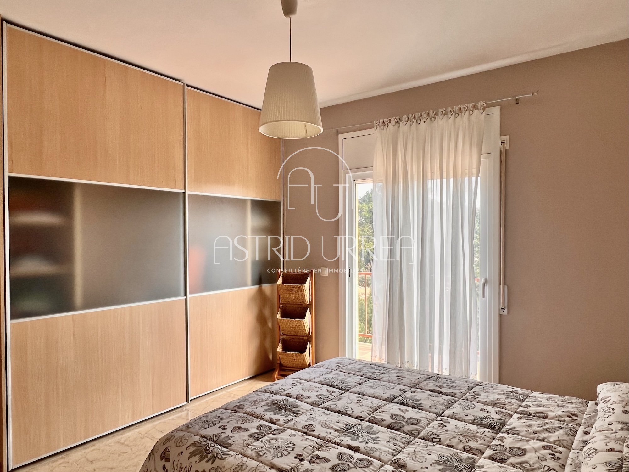 The single-story house, with direct access from the street, features a large, separate kitchen, a bright living room opening onto the terraces and barbecue area, and a sleeping area with three bedrooms and a bathroom. The spacious master bedroom has a large built-in wardrobe with sliding doors and access to a terrace offering panoramic views of the hills.